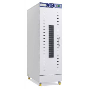 Устройство оснащено простой и надежной электромеханической панелью управления с таймером на 24 часа, четырьмя вентиляторами и двумя нагревательными элементами, которые обеспечивают равномерное распределение тепла. Встроенный аварийный термостат отключает нагрев при превышении температуры 120 градусов, предотвращая перегрев. Дверца со смотровым термостойким стеклом и вентиляционными отверстиями позволяет следить за процессом, не открывая шкаф. Колесики облегчают перемещение аппарата по кухне или производственному помещению.