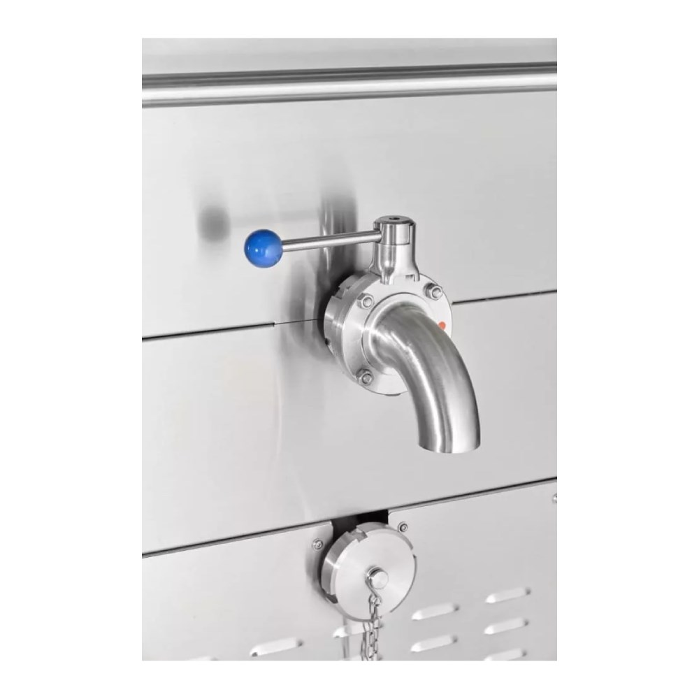 Устройство оборудовано двумя сливными отверстиями: одно — для слива готового продукта, второе — для полного удаления содержимого, что облегчает уход за аппаратом. Производительный смесительный механизм со встроенными скребками обеспечивает качественное перемешивание компонентов и равномерную структуру готовой массы. Аппарат может не только нагревать, но и охлаждать содержимое, позволяя точно соблюдать нужный температурный режим. Для удобства перемещения предусмотрены четыре колеса, два из которых имеют стопоры для фиксации оборудования в рабочем положении.