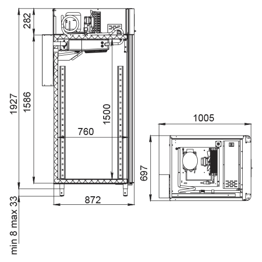 Каталог оборудования Холодильное оборудованиеШкафы холодильныеСпециализированные холодильные шкафыШкаф холодильный для вызревания салями Polair CS107 Salami со стеклом Шкаф холодильный для вызревания салями Polair CS107 Salami со стеклом Код товара: 062-631 Поделиться: WhatsAppTelegram СравнитьДобавить в КПВ избранное 0 385 050 ₽ В корзину 0 шт Под заказСамовывоз сегодня бесплатно Взять в кредит Купить в лизинг Получить консультацию в WhatsApp Описание Характеристики Отзывы 0 Инструкции 5 Шкаф холодильный для вызревания салями Polair CS107 Salami со стеклом предназначен для приготовления и хранения салями, сыровяленых колбас и других мясных деликатесов на предприятиях общественного питания и торговли. Корпус цельнозаливной конструкции выполнен из нержавеющей стали снаружи и внутри (кроме задней стенки), что обеспечивает высокую прочность и долговечность. Дверь выполнена в виде стеклопакета для удобного визуального контроля. Оборудование рассчитано на работу при температуре окружающей среды до +40 °С. Особенности: Динамическое охлаждение с мягким обдувом без заветривания Верхнее расположение агрегата Автоматическая оттайка с системой испарения конденсата Русифицированная многофункциональная панель управления с дисплеем 5" и возможностью создания и сохранения собственных программ Встроенный ультразвуковой увлажнитель (необходима подача очищенной воды и подключение к канализации) UV-лампа для обеззараживания воздуха внутри камеры 3 пары направляющих с тремя перекладинами и подвесами для колбас Регулируемый уровень влажности: от 60 до 95 % Распашная дверь с заливной теплоизоляцией, встроенной ручкой и магнитным уплотнителем Отключаемая внутренняя LED-подсветка Штампованное углубление в дне корпуса для удобства ухода Педаль для удобного открытия двери Хладагент R290 (пропан) Толщина стенки корпуса: 43 мм Polair CS107 Salami со стеклом — это профессиональный шкаф, разработанный специально для мясных деликатесов. Он обеспечивает оптимальные условия для ферментации и хранения продукции за счёт точного контроля температуры и влажности, продуманной конструкции и удобного функционала. Такой шкаф станет надёжным решением для мясных цехов, гастробаров и специализированных магазинов.Изображение товара, представленного на фото, может отличаться от его фактического вида. Показать все Габаритные размеры697×1005×1960 ммДиапазон рабочей температурыот -2 до +30 °CДлина697 ммШирина1005 ммВысота1960 ммОбъём700 лКол-во дверей1 Тип двериСтеклянная Уровень влажностиот 60 до 95 %Холодильный агрегатВстроенный Тип оттайкиАвтоматическая Тип охлажденияДинамическое ПодсветкаЕсть UV-лампаЕсть ХладагентR290 Вес нетто160 кгВес брутто190 кгБрендPolairВсе специализированные холодильные шкафы Из нержавейкиВсе специализированные холодильные шкафы Стеклянная дверь Оставить отзыв Еще никто не оставил отзыв на этот товар Схема POLAIR CS107 Salami.jpgИнструкция на POLAIR CS107 Salami.pdfБрошюра на POLAIR CS107 Salami.pdfДекларация о соответствии.pdfСертификат соответствия.pdf Похожие товары Перейти в каталог В наличии 405 365 ₽ Шкаф холодильный для хлебопекарных производств Polair CS107 Bakery Br черный, со стеклом (Тип 2) Под заказ 385 050 ₽ Шкаф холодильный для вызревания салями Polair CS107 Salami со стеклом Под заказ 414 545 ₽ Шкаф холодильный для хлебопекарных производств Polair CS107-Bakery Br со стеклом (Тип 1) В наличии 403 670 ₽ Шкаф холодильный для хлебопекарных про