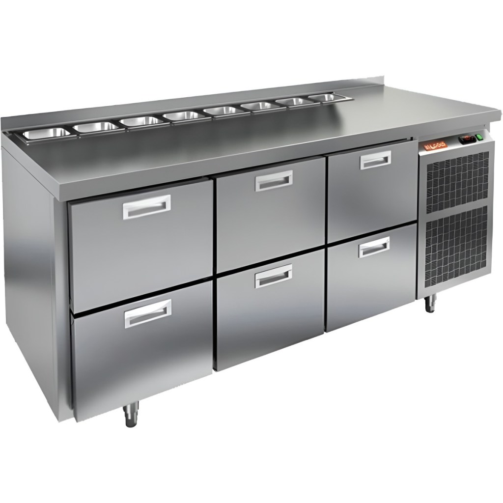 Такая конструкция позволяет повару работать быстрее и эффективнее, так как все необходимые продукты находятся под рукой. Корпус и столешница выполнены из прочной нержавеющей стали, устойчивой к коррозии и легко поддающейся санитарной обработке.
